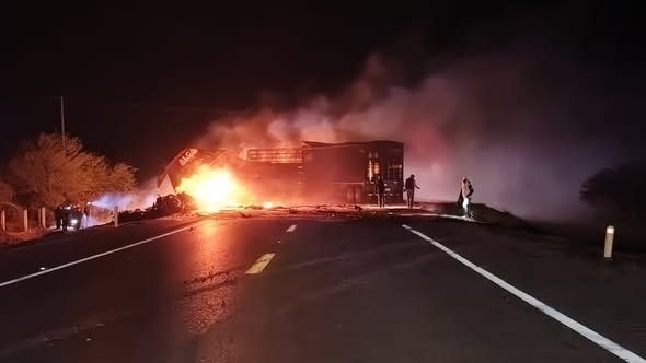 Accidente entre dos tráileres causa que ambas unidades se incendien. Autoridades cierran carretera Tamaulipas, a 5 de diciembre de 2025.- Un trágico accidente vial se registró en la carretera nacional Tampico-Victoria, a la altura del Ejido El Centauro, en el